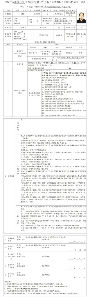 张丹申报评审建筑工程系列市政环境卫生工程专业技术职务任职资格情况一览表