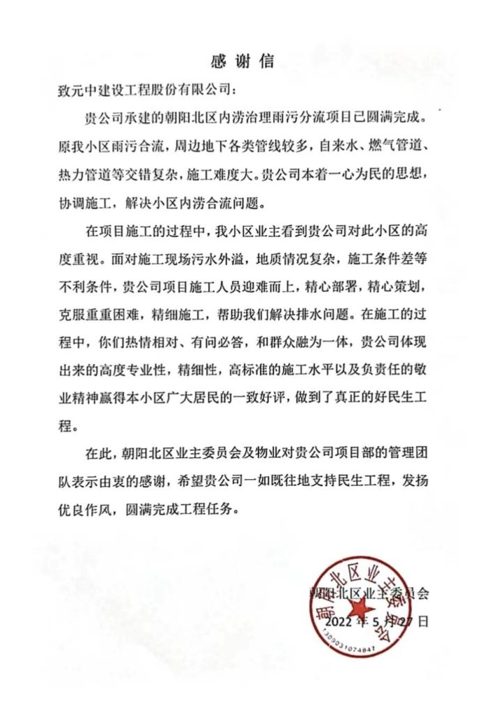 5月28日,元中建设小街小巷雨污分流工程运西项目部收到来自朝阳北区业主委员会及物业的锦旗及感谢信,来信对项目部的工作部署和高标准施工水平给予高度评价,同时表达了诚挚的谢意。