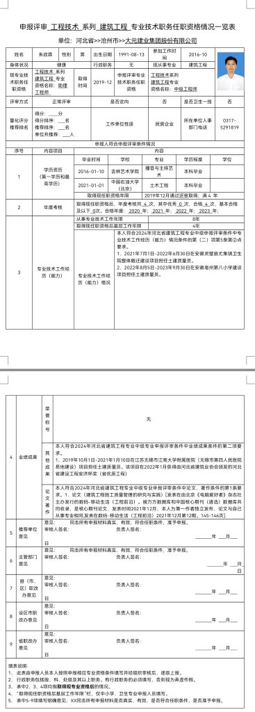 朱政霖申报评审工程技术系列建筑工程专业技术职务任职资格情况一览表
