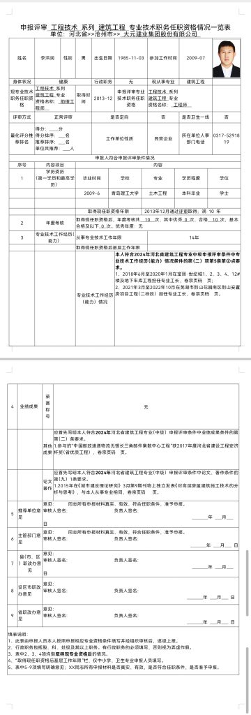 李洪润申报评审工程技术系列建筑工程专业技术职务任职资格情况一览表