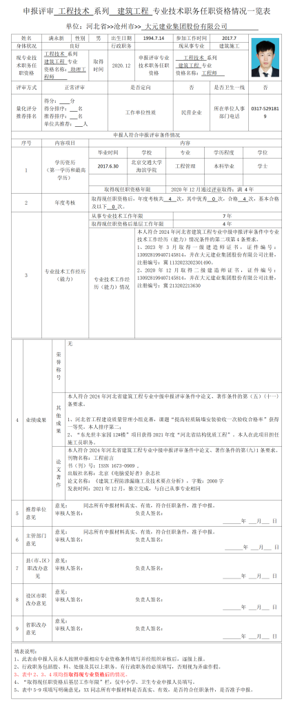 满永新申报评审工程技术系列建筑工程专业技术职务任职资格情况一览表
