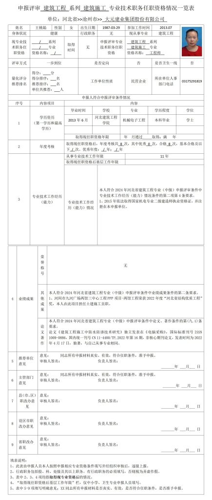 王桃娟申报评审建筑工程系列建筑施工专业技术职务任职资格情况一览表