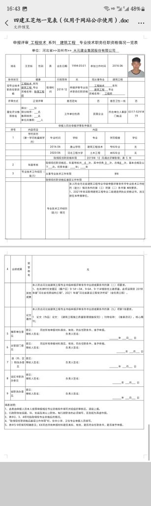 王芝旭申报评审工程技术系列建筑工程专业技术职务任职资格情况一览表