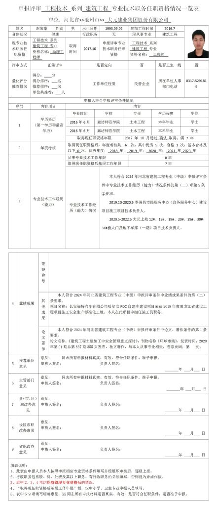 赵家豪申报评审工程技术系列建筑工程专业技术职务任职资格情况一览表
