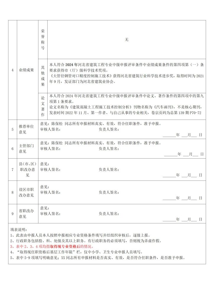 陈保松申报评审工程技术系列建筑工程专业技术职务任职资格情况一览表
