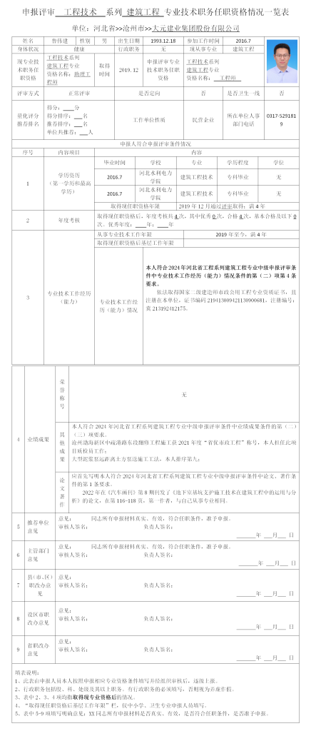 鲁伟建申报评审工程技术系列建筑工程专业技术职务任职资格情况一览表