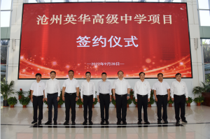 9月28日上午,沧州市经济开发区管委会隆重举行沧州英华高级中学项目签约仪式。沧州市人民政府副市长尹卫江、沧州经济开发区党工委书记、管委会主任赵宝良、党工委委员、副主任蒋福森、李长鑫、投资促进局局长孙博、大元集团党委书记、董事局主席李建国、大元投资集团副总裁郝书明、大元实业发展集团总裁王俊超、衡水市教育机构校长高辉、河间市英华高级中学校董许红东等人参加签约仪式。 沧州英华高级中学全面借鉴衡水先进教育